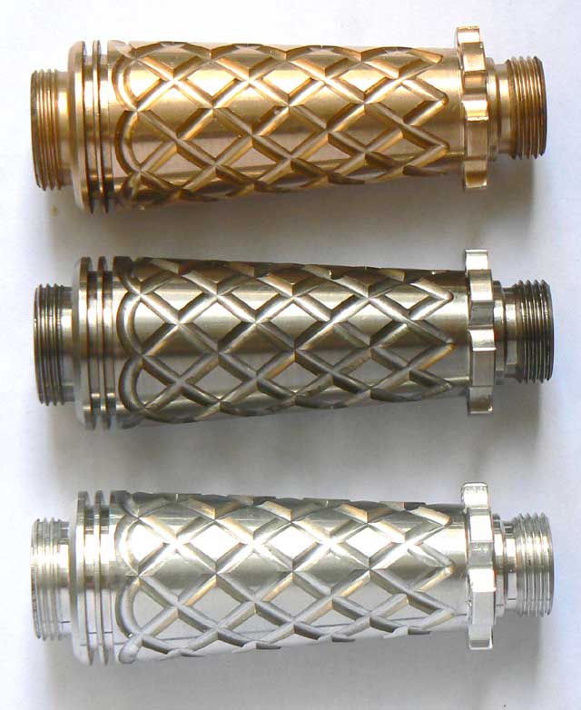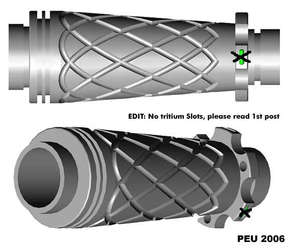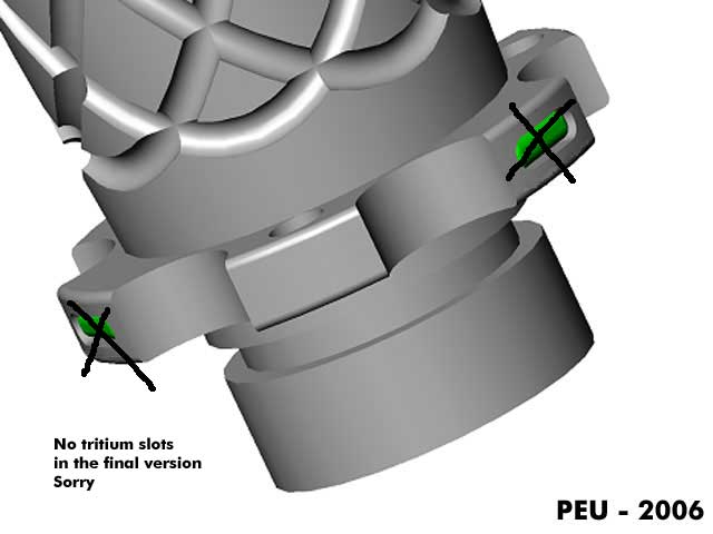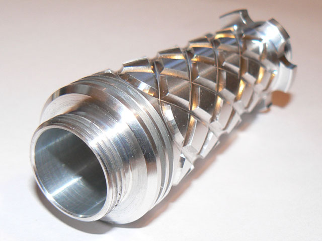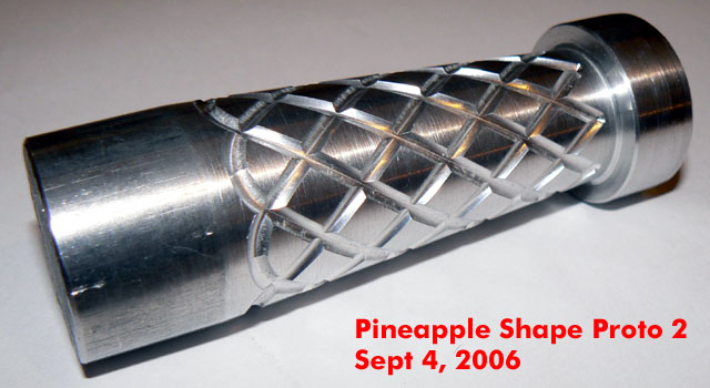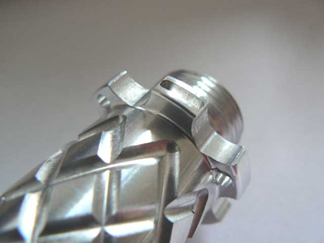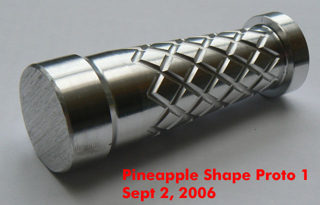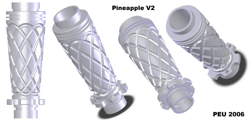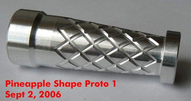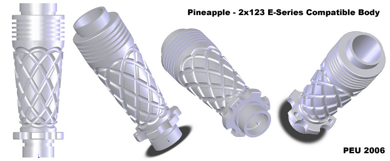 Sometime around mid/2006 while I had some spare time, I spent it drawing a 2x123 E-series compatible body inspired by this unique piece: ![]() I've shown the results to some friends and they liked it, so I posted about it in the CPF, the crowd spoke and I made it happen. Here is the evolution of the project: The Pineapple Please visit The Pineapple Gallery The first CAD renderings ![]() ![]() Machining the first prototype ![]() ![]() The first prototypes ![]() ![]() ![]() ![]() at this point I asked about which one to make, the votes were favorable to the second prototype, which was also my choice. As a plus I offered to add tritium slots to the body, but after making the prototypes I discovered that the tritium slots left thin walls at the sides thus making that part of the body fragile, I apologized and that feature was removed from the final production units. ![]() ![]() ![]() This is the first finished prototype ![]() And these are the first annodized ones ![]() ![]() This last image shows all the bare flavors offered: Brass, Titanium and Aluminium ![]() The production of the anodized units finished succesfully ![]() ![]() Please visit The Pineapple Gallery Powered by QwikiWiki 1.5.6- www.qwikiwiki.com