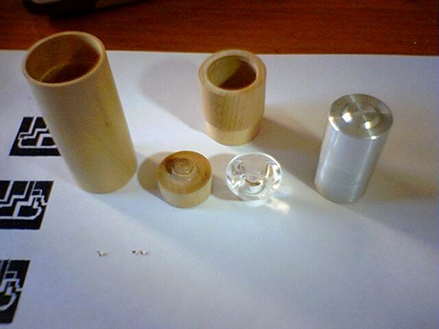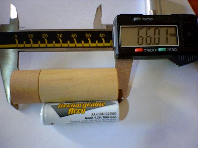 First published photo, all the non available parts where modelled in wood Size comparision with an AA battery Measuring the prototype, this measure is the same as the final product!! Failure to make a PCB using a dremel Introducing The Wooden Skin Concept